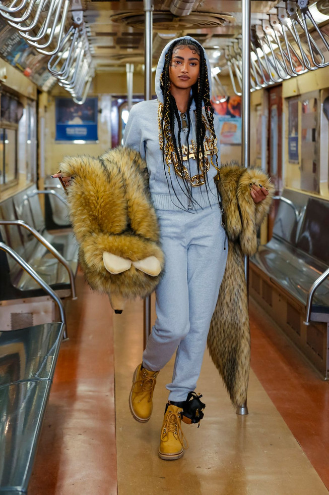 Let's celebrate the apparent wins of this show. It is the first runway show to take place at the Transit Museum to celebrate its 18th anniversary. The runway show highlighted New York City subway culture, including an exceptional 'Its Showtime' dance performance. Front row seats lined the narrow train cars to watch the show for a close-up view of every look. The show took a year of planning to ensure the proper execution and genuinely unique experience.